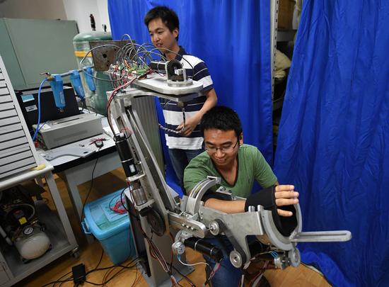 沈陽自動化所科研人員在測試一款研制階段的醫(yī)療手術(shù)機器人(2015年7月30日攝)。新華社記者 姚劍鋒 攝