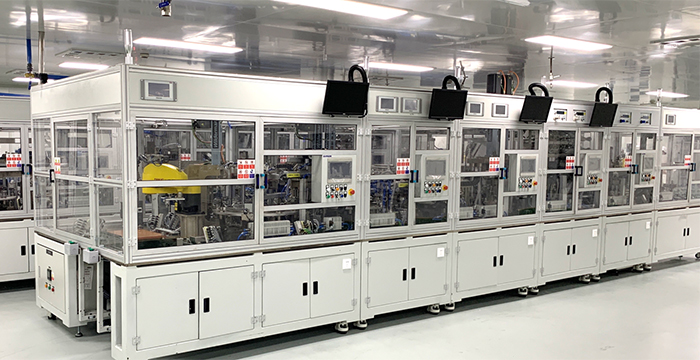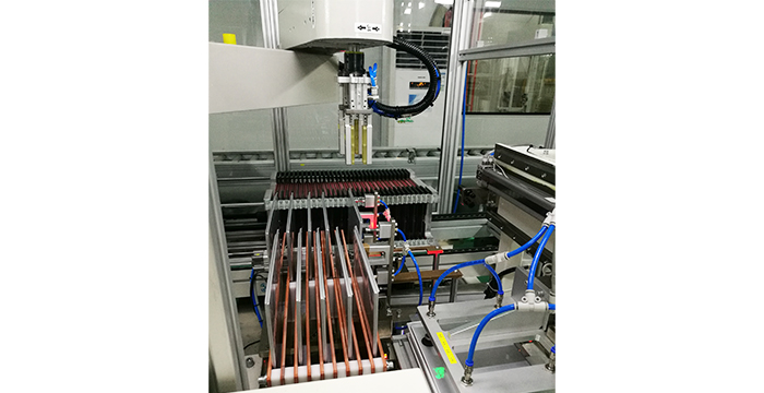 其二、鋰電化成分容生產(chǎn)測(cè)試系統(tǒng),覆蓋鋰離子電芯測(cè)試工序的全部工藝過(guò)程,實(shí)現(xiàn)注液電芯接收到電芯成品下線整個(gè)過(guò)程的全自動(dòng)化生產(chǎn)。在倉(cāng)儲(chǔ)物流系統(tǒng)的管理調(diào)度、安全、專機(jī)效率和系統(tǒng)柔性等多方面進(jìn)行了優(yōu)化。自研的拘束工裝,對(duì)產(chǎn)品外觀實(shí)現(xiàn)了良好的保護(hù),滿足了生產(chǎn)工藝的需求。并獲取了《一種兼容型軟包電池加電測(cè)試裝置》和《一種軟包鋰電池化成分容治具》兩項(xiàng)發(fā)明專利;