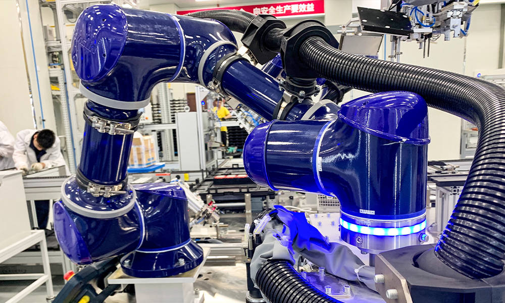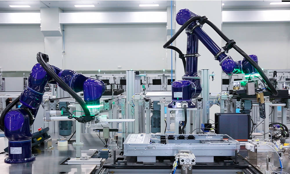 協(xié)作機(jī)器人占地空間小,無需圍欄,該生產(chǎn)線實(shí)現(xiàn)了多個(gè)工站一站3機(jī)的布局,在行業(yè)內(nèi)屬前端應(yīng)用。該項(xiàng)目應(yīng)用了大量融合視覺傳感器的協(xié)作機(jī)器人,能夠精準(zhǔn)完成定位,條碼掃描,檢測等工作,能夠代替人工極大程度提升產(chǎn)線的品控質(zhì)量。